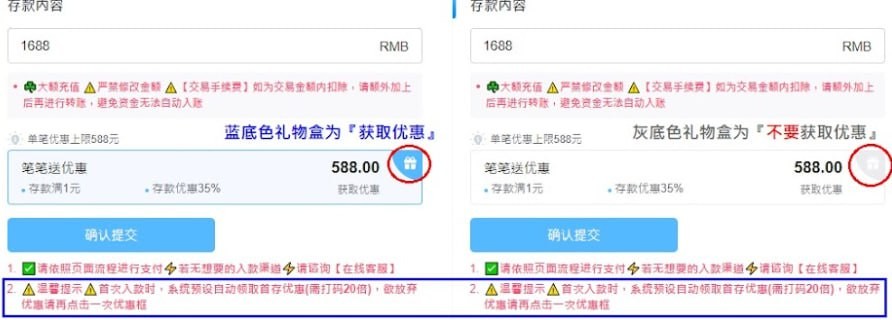 1。首存 35%,最高588,流水20倍(可不领取)