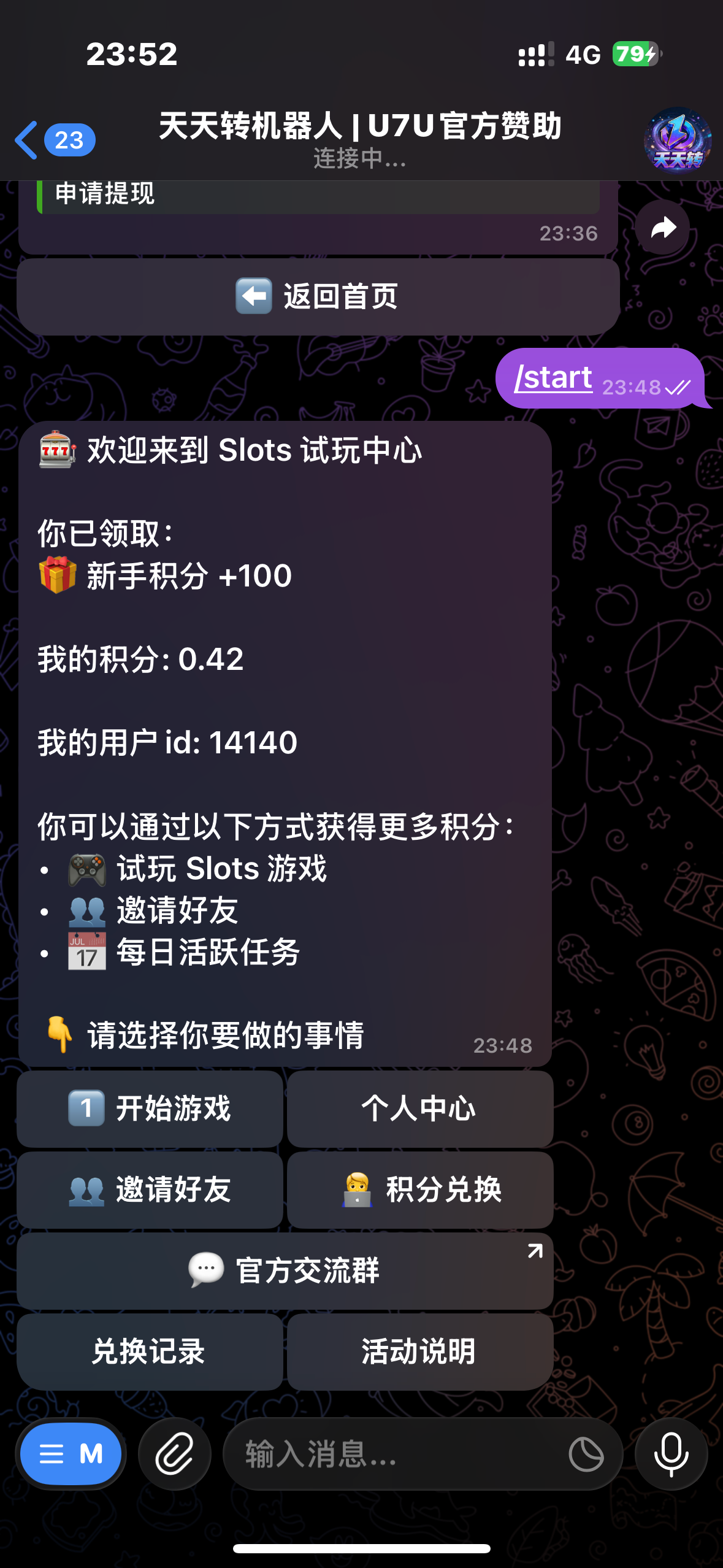 送的100积分去拉pg打到一定数量可以提现 只有飞机才可以撸 我没打出来